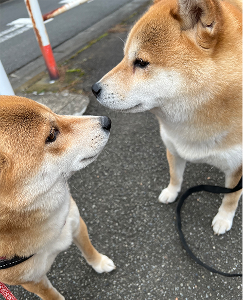 柴犬は、ワンちゃんや人と「柴距離」というちょっと離れた間合いをとることが多いですが、このふたりの距離感はとっても近いです。